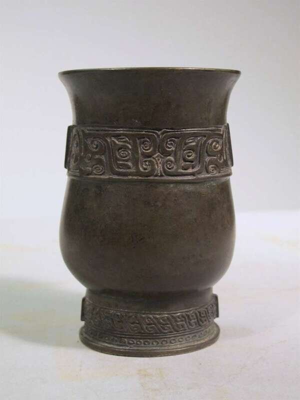 Pear form body of oblong cross section, decorated with a band of archaic style scrolling clouds around high waist and elevated footring.