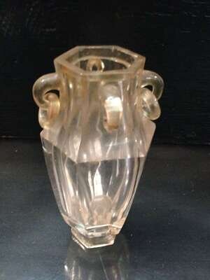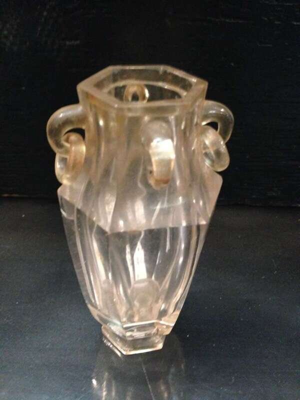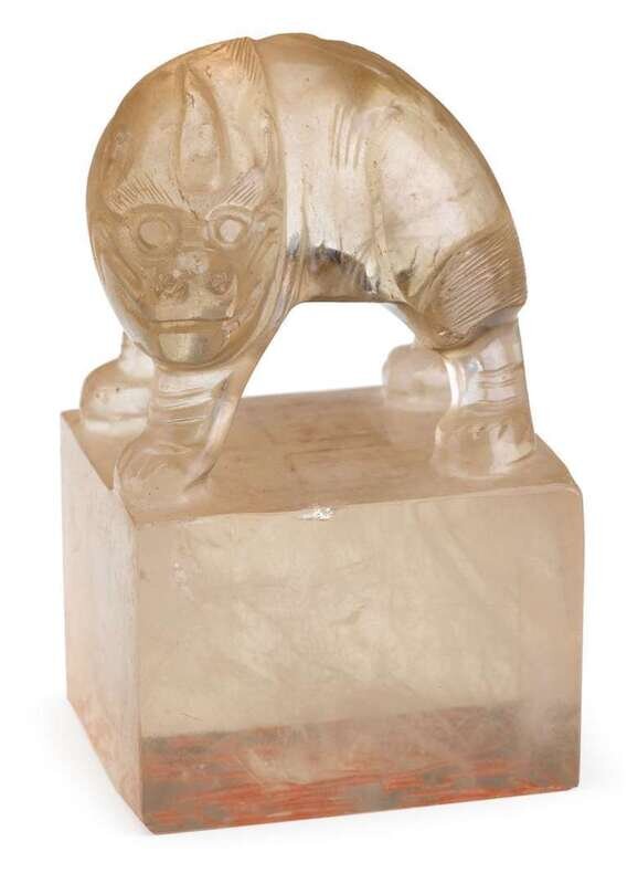 The large square seal surmounted by fu beast with arched back; matrix carved in archaic script; together with a hexagonal rock crystal vase with ring handles (2).