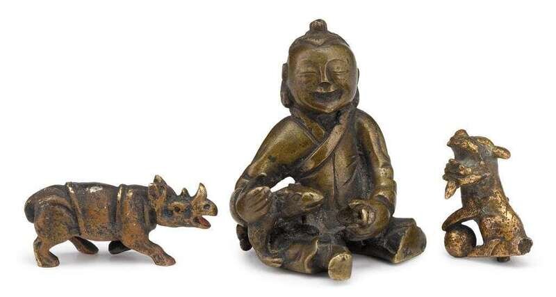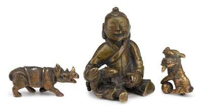 Comprised of a seated male figure feeding a squirrel, a miniature rhinoceros, and a miniature fu lion with a ball.