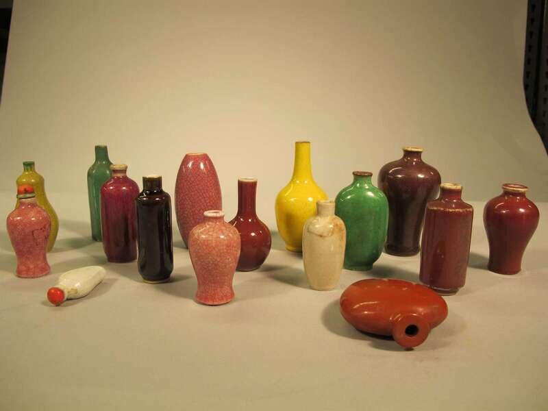 Comprising 16 snuff bottles and miniature vases of various forms and colors.