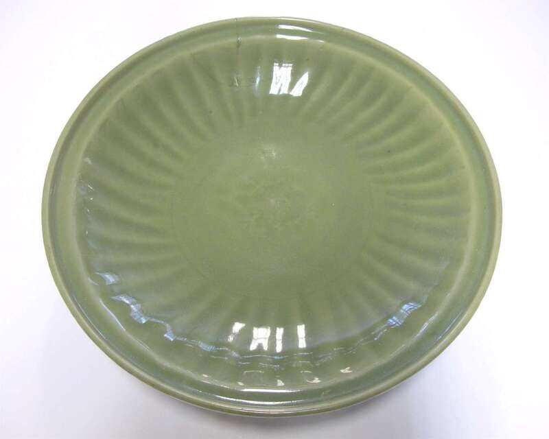The carved charger with ribbed interior and faint central floral design; thick bubble-suffused glaze of light olive green tone; repaired.