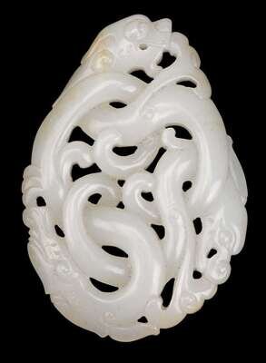 The openwork oval pendant deftly carved to show three intertwined snake-like qilong whose heads face the same direction and whose bodies are coiled in such away as to create an infinite knot.
