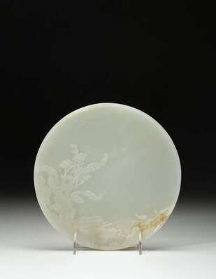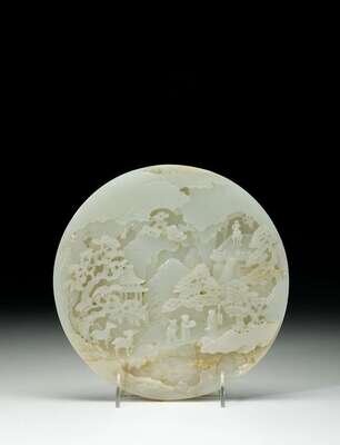 Deeply carved to show an elder and two attendants followed by deer through a rocky landscape in which trees, a house and a shrine are nestled; the reverse carved to show flowers and lingzhi rising from between rocks; white translucent nephrite stone of mostly even tone with some light brown and milky inclusions.