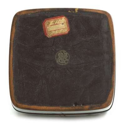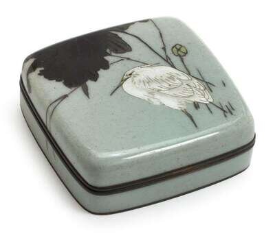 The light grey square box with rounded edges and corners worked to show a wading egret under a wide grey-green leaf; the interior and underside brown enamel; shakudo rims.
