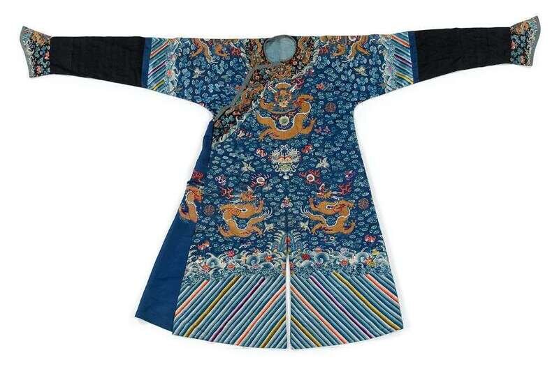 Of typical form and configuration; colorfully embroidered over a blue ground to show nine dragons above a wide lishui hem and flying among auspicious symbols.