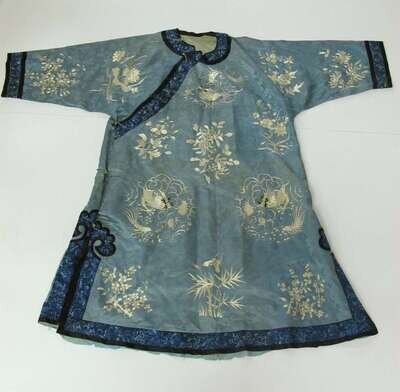 The pale blue robe embroidered in white silk to show dragons and flowers; trimmed in darker blue embroidered silk.