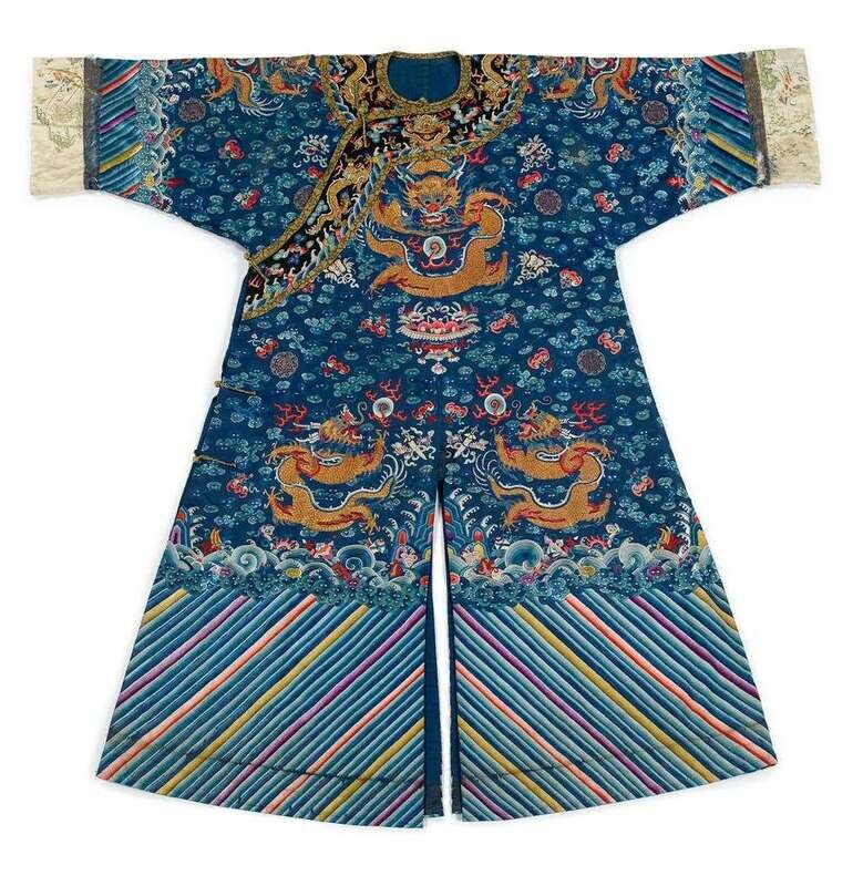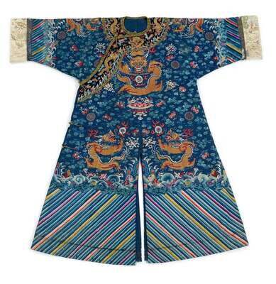 Embroidered all around with nine five-clawed dragons chasing flaming pearls amidst ruyi clouds interspersed with bats, fu emblems, and other buddhist symbols, against a navy blue ground; terrestial diagram and multicolored lishui stripes to hem; sleeve hems decorated with female figures in a garden landscape.