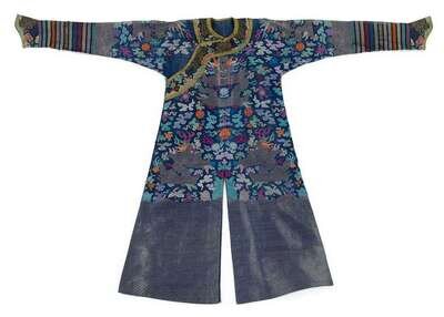 With counted threads, embroidered with prescribed nine five-clawed dragons, all amidst ruyi clouds and other auspicious emblems above a lishui stripe bottom, decorated with similar designs to collar and horsehoof cuffs.
