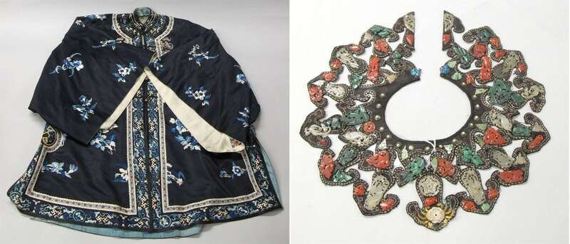 The elaborate collar adorned with carved jade, carnelian and malachite, glass and pearls; together with a floral-embroidered midnight blue lady's tunic.