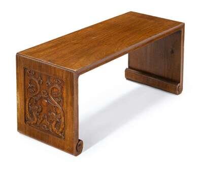 The single rectangular top plank is raised on two solid scroll-form ends, carved to show a central medallion of twin dragons and flaming pearl. .