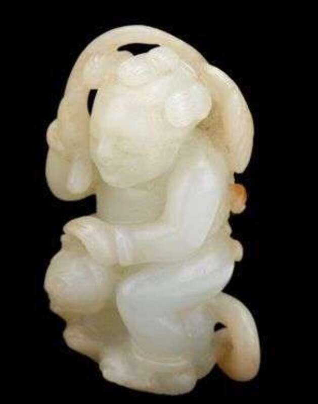 The miniature openwork carving depicts a boy attendant holding a large palm leaf astride a cat.