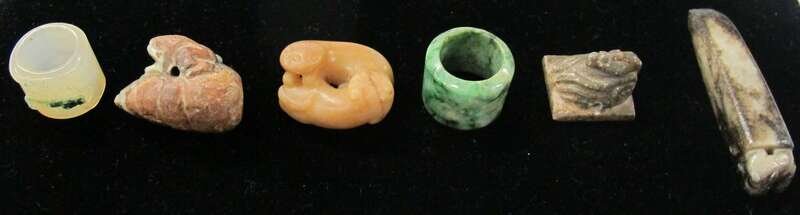 Comprising a grey jade archaic form pendant, a brown bird-form seal, a dark grey and russet jade carving of a frog on a snail shell, a yellow jade carving of two cats, a mottled green jade archer's ring and a agate archer's ring carved to show a grass hopper on a lettuce leaf.