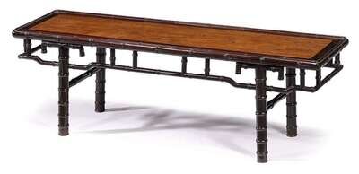 The frieze, legs and stretchers all carved to resemble bamboo sections, top panel inset with wood of lighter yellow hue.