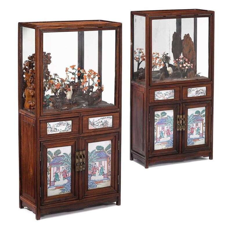 The miniature cabinets inset with porcelain plaques decorated to show figures in outdoor pavillions and surmounted by glass-enclosed displays of cranes in a rocky landscape renderd in jade, wood and other hardstones.