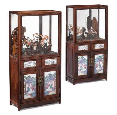 Pair of Chinese hongmu, porcelain and mixed media display cabinets qing dynasty