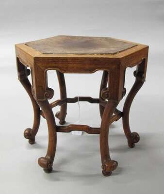 Of hexagonal form, the top inset with a hexagonal piece of burlwood, waist joined to six everted legs by cloud shaped designs, connected to a hexagonal ring midway above feet, supported on six raised pads.
