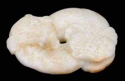 The rubbed and flattened carving depicts two mirrored catfish centered around a hole at middle.