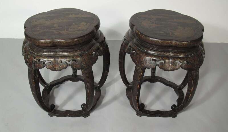 The drum-like cinquefoil stools with bowed legs and ring base lacquered and painted throughout in the chinoiserie style.