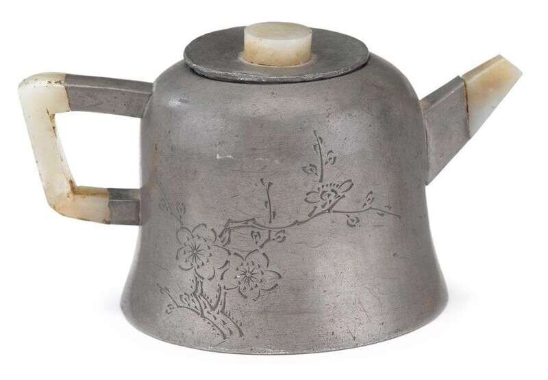 Of rounded bell form; the handle, short square spout and circular knop of white jade; inscribed and incised verso to show peony blossoms.