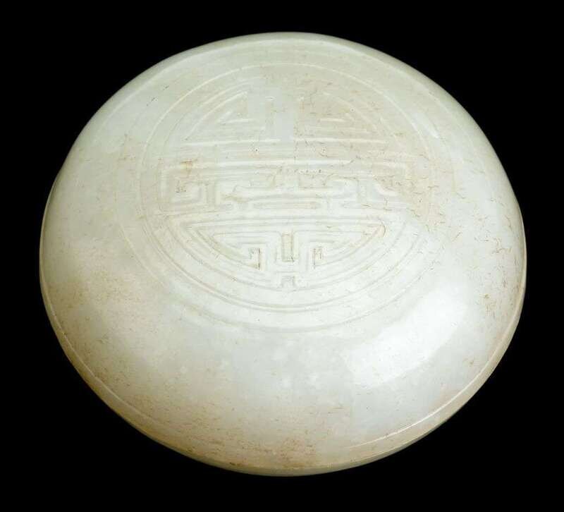 The domed cover carved with circular 'shou' symbol; stone of mottled white hue.