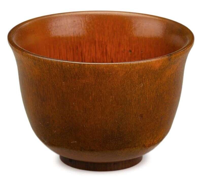 Of unadorned cup form with slightly everted rim and shallow foot; of translucent orange-brown hue.