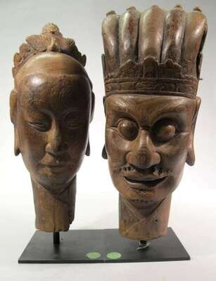The male head carved as a Ming official with bulging eyes and inset with horse hair whiskers; the female with plainer features and expression; mounted to metal stands.