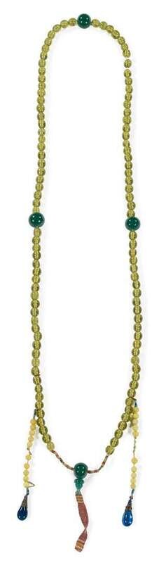Comprising of 108 lime green beads, interspersed with four larger spinach green beads and three strings of smaller opaque glass beads each terminating in a blue glass tear drop pendant.