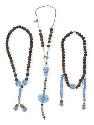 The wooden beads carved to show 'Shou' symbols and the pale blue glass beads and medallion carved in facets; separated and re-strung into three necklaces.