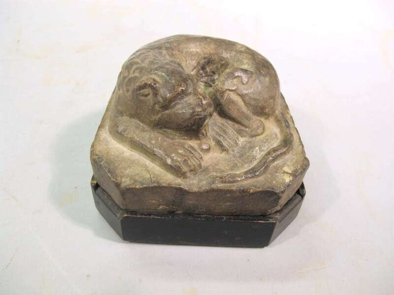 Carved as a coiled recumbent lion raised on an octagonal base.