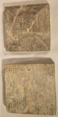 One of seal form with trapezoidal top, the other of square form; incised to show figures and mythological beasts and inscribed.
