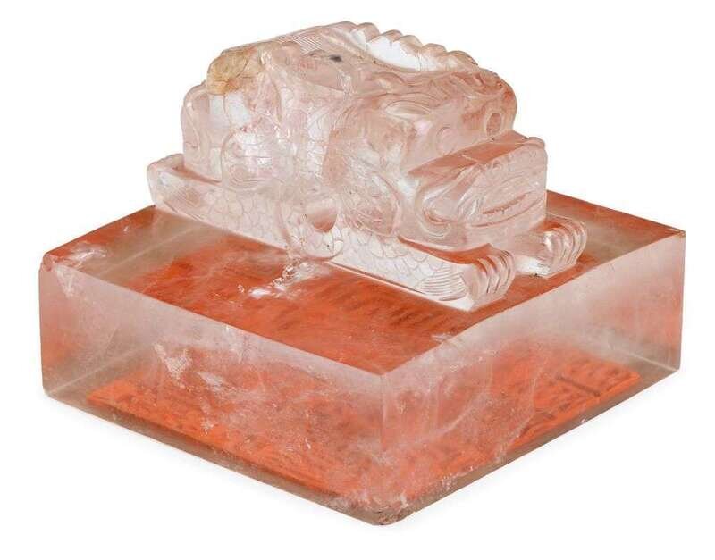 The square seal with 6 character matrix, surmounted by double beast form handle.