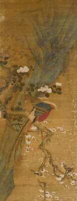 Ink and color on silk, depicting a scene of a male and a female pheasant standing on branch and with three seal marks of the artist; Sight H: 51 inches x W: 20 inches