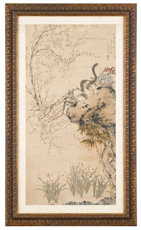 Hanging scroll, framed, ink and color on paper, inscribed "Fang nan tian lao ren bi yi"-painted in the style of Yun Shou Ping, signed Cao Qi and with two artist seal marks; sight H: 50 inches x W: 25 inches