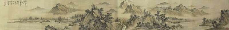 Hand scroll, ink and color on paper, inscribed with a poem of "huai zhen lou"; signed and sealed by the artist, with "bai yun tang" and "nan hai huang shi" seal marks; sight H: 92 inches x 11 1/2 inches