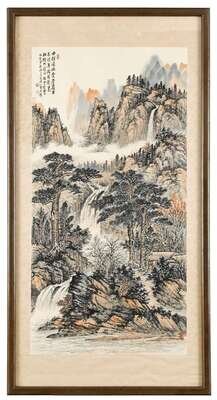 Mounted and framed, ink and water color on paper, inscribed with a poem and signed eighty-nine year elder Huang Jun Bi, with four seal marks of the artist; sight H: 53 inches x W: 26 1/2 inches