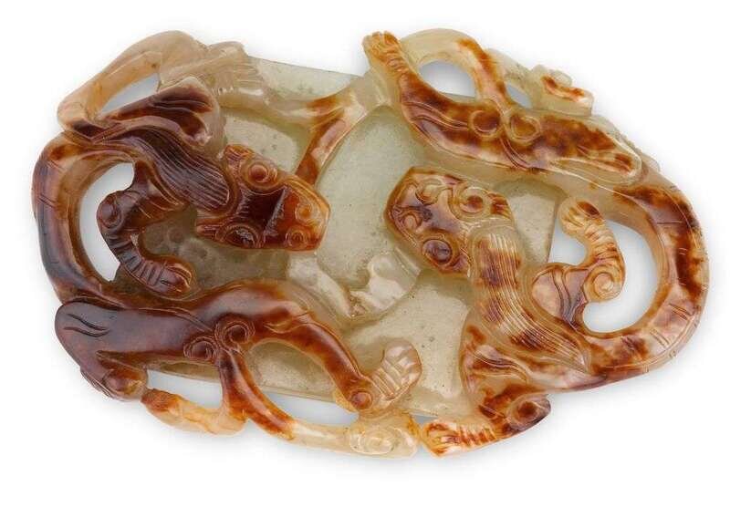 A Chinese carved white and russet jade belt buckle ming dynasty