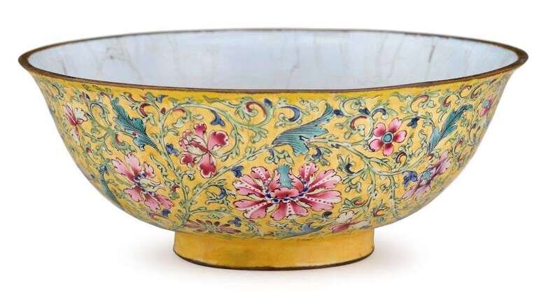 The footed bowl of typical form, vibrantly enameled to exterior with scrolling lotus flowers over an egg yolk yellow ground.