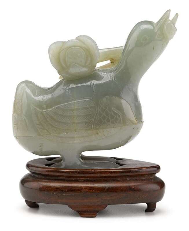 Carved as a standing duck holding a lotus flower in its beak.