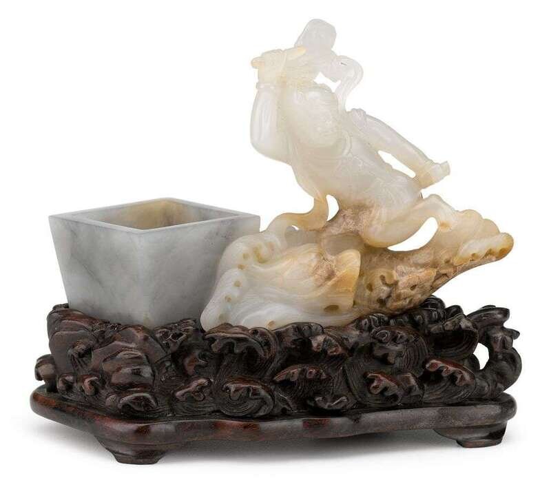 Carved from a single tri-toned piece of jade, the cubic grey-tone stand is flanked by a celestial male figure riding over a sea dragon; russet inclusions to bottom; fitted on a wooden stand .
