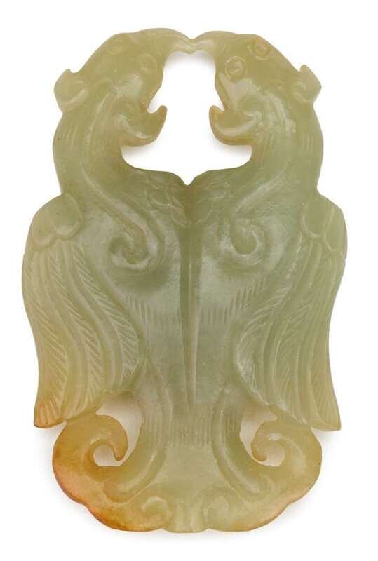 The greenish yellow jade is carved down the middle to show two symmetrical beasts with beaked qilin heads and bird bodies, hollowed between necks and toward tails, connected at beak.