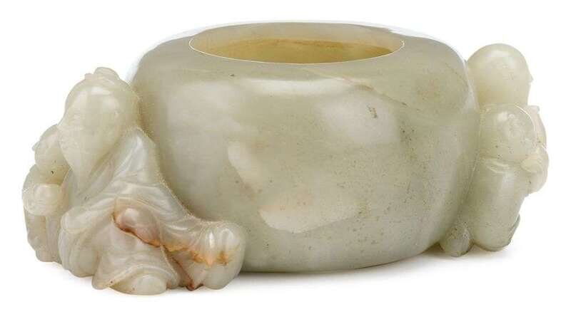 A Chinese grey jade brush washer jiaqing mark to base, 20th century