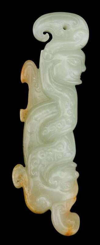 Carved to show an intertwined pair of human faced, snake bodied figures, representing Chinese mystical figures "nu wa" and "fu xi"; jade of greenish yellow with streaks of russet.