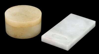 Comprised of a small white jade inkstone with olive-colored includsions, and a small circular white jade box and cover.