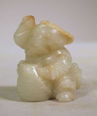 The miniature carving depicts an aged fisherman holding a fish above his basket.