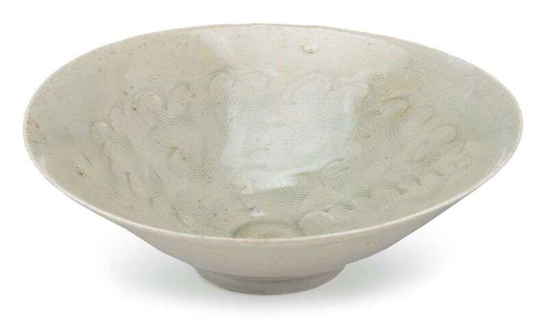The conical bowl of light celadon hue and incised with swirling, floral pattern; Japanese collector's mark to base.
