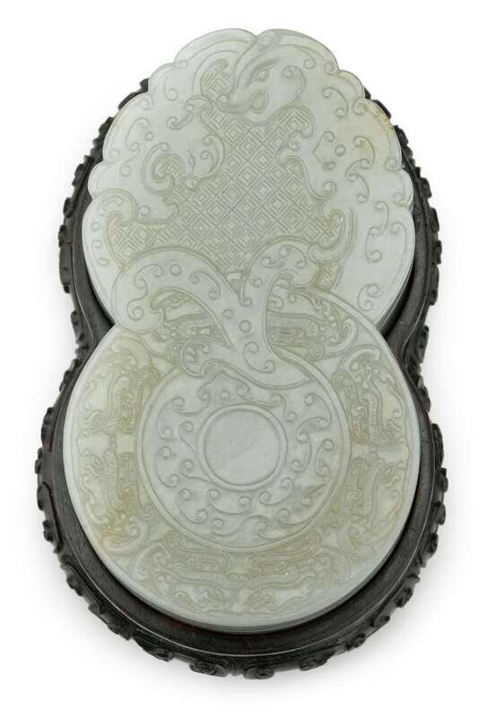 Of typical shape, the top cover carved to show animated dragon and phoenix over geometrical ground, hovering over a medallion of archaic design surrounded by wave-like symbols, surmounted over fitted stand.