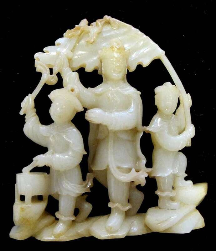 Of an arched form, the statue is hollowed to show a Ming adult soldier raising his sword flanked by two cheery young soldiers, one playing the drum, and the other raising a banner.
