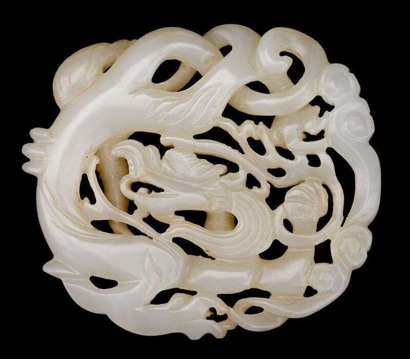 Of clear white tone, the pendant carved to show a coiled dragon staying afloat in clouds.