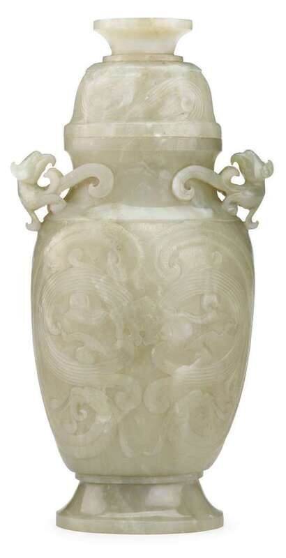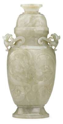 Of typical form over everted foot, the vase is carved to show two opposing qilong curled inside two opposing phoenix on both sides over geometric ground; suspended by a pair of handles in the design of a beaked beast; mounted by a lid carved to show two dragons to front and back over geometric ground.