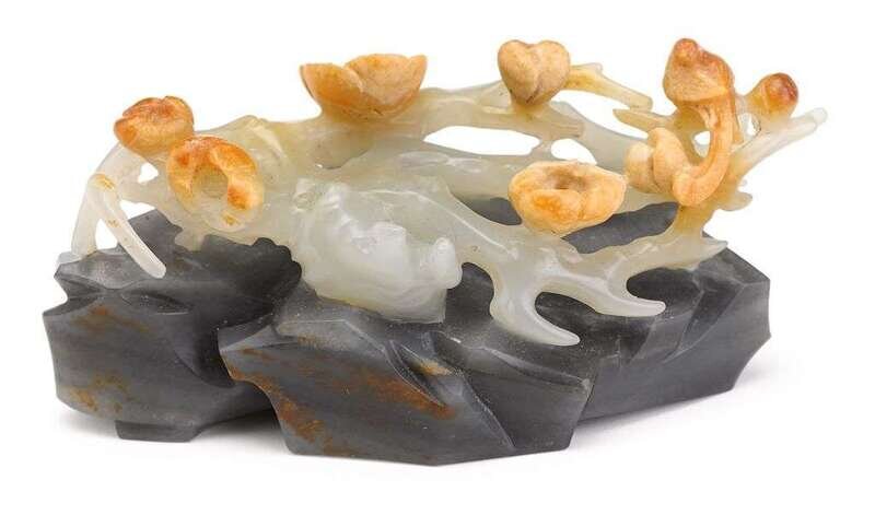 Carved to show a top layer of russet overlaid prunus flower, buds, and a magpie over a middle layer of celadon branches, all situated on a grey jade rock-like base.